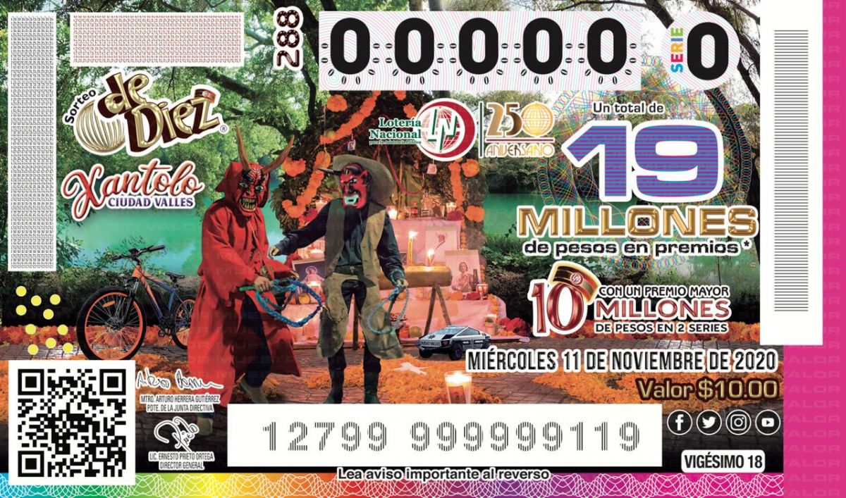 El nuevo billete de la Lotería Nacional cuenta con elementos como un altar de muertos, personajes de las comparsas con máscaras de madera, una panorámica del río Valles y la Ecovía, imagen donde sobresale el verde turquesa, color que caracteriza los ríos de la zona huasteca.