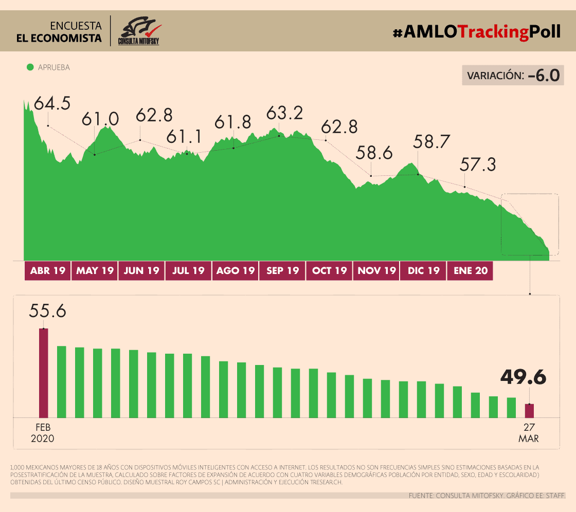 La #AMLOTrackingPoll es un ejercicio estadístico diario sobre la aprobación o desaprobación de la gestión del presidente Andrés Manuel López Obrador, realizado por Consulta Mitofsky…