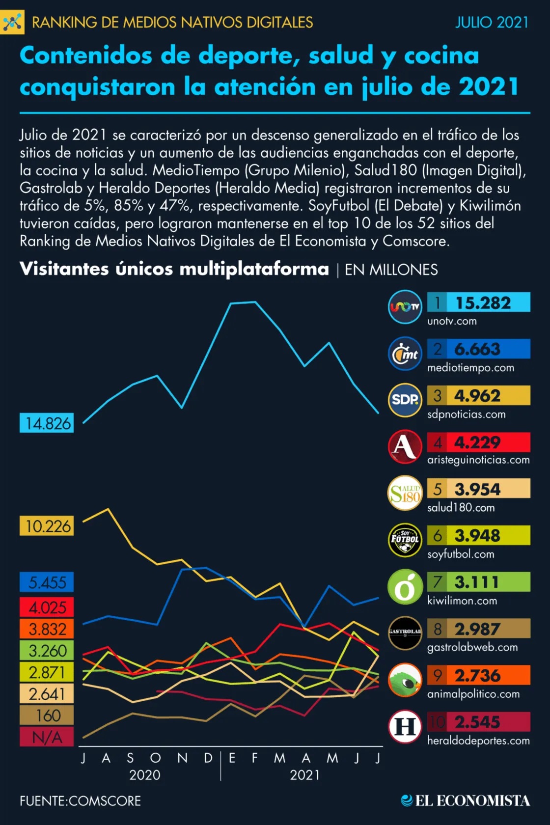 Con base en los datos reportados por Comscore para julio 2021, dentro del top 10 del Ranking de Medios Nativos Digitales de El Economista y Comscore sólo 4 de medios tuvieron un crecimiento en el mes y 3 de los cuales crecieron a doble dígito. En lo que respecta a la segunda parte del ranking, las posiciones del 11 al 20, 6 de los 10 medios de este segmento crecieron y todos lo hicieron a doble dígito.