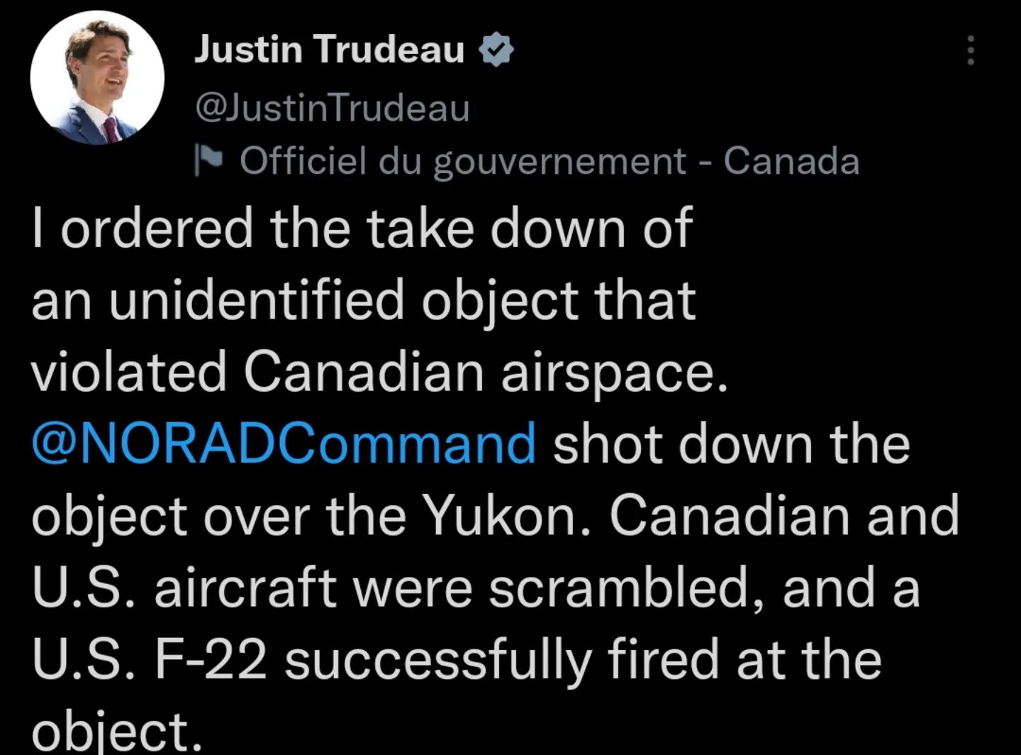 La fuerza aérea de Canadá y de Estados Unidos actuaron en conjunto y un F-22 de Estados Unidos disparó al objeto”, tuiteó Trudeau.