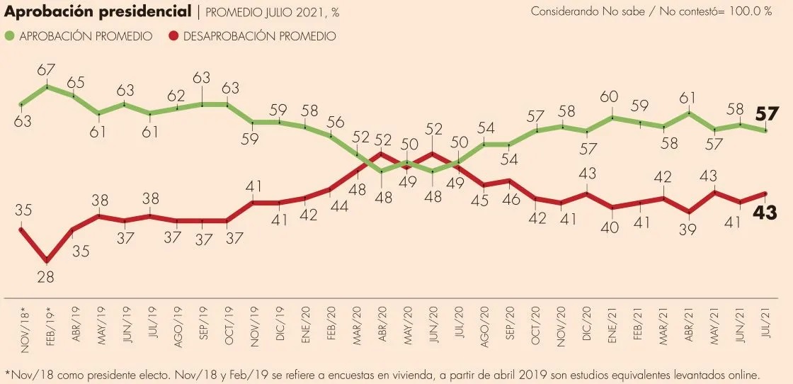 Entre junio y julio del 2021, la aprobación promedio del titular del Ejecutivo federal, Andrés Manuel López Obrador, disminuyó al pasar de 58 a 57%,…